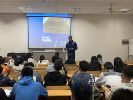 杨璟勇老师为学员讲授足球竞赛规则发展史,上海市足球协会裁判技术讲师、上海理工大学体育教学部金俊老师作为特邀讲师为学员进行足球竞赛规则第1-5章的讲解。